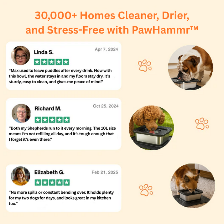 Give your pup the PawHammr bowl for a full month. If your floors aren’t drier, your home isn’t cleaner, and your dog isn’t drinking happily — send it back. No hassle, no stress, full refund. We stand behind every sip.